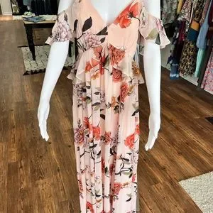 NWT Lulu’s pink floral maxi dress with beautiful ruffle details. Never worn. Size Small.