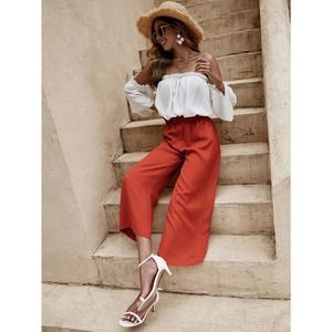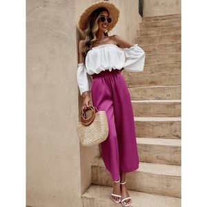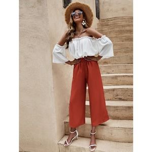 2 piece set: boho Off The Shoulder Frill Trim crop Top & wide leg pants blue