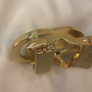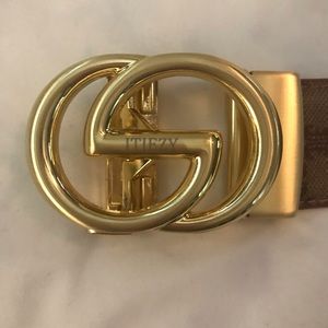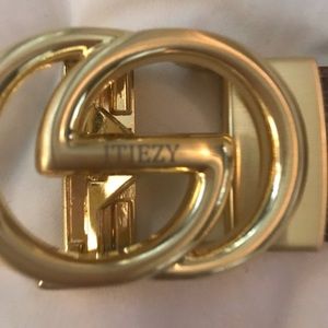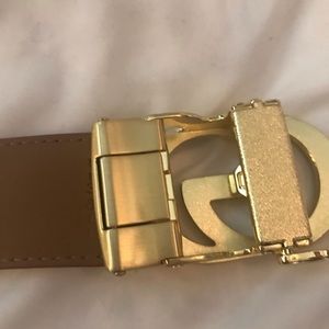 Itiezy brand tan belt with gold double G buckle. Very fashionable and similar in style to a popular expensive brand belt. NWOT, never been worn. Has a track so no hooks or holes for perfect fit. Also marked on inside are markers with measurements where belt can be cut to make smaller if needed. Buckle has adjustable latch to place on end of belt is cut. See pics for latch opening to readjust. To fasten the belt a pic is attached showing the small latch/knob that you will lift to insert the belt to slide into the buckle and tighten or adjust. Measurements of length of belt from end to end, width of belt and buckle, and also measurement from first hole to end are available in last pics.