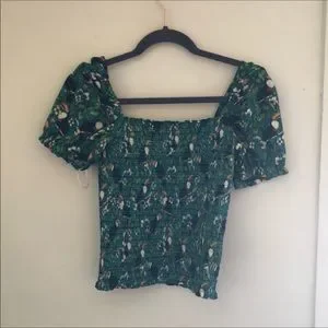 # Anthropologie puff sleeve top gathered cropped bodice tropical pelican bird birds toucans soft jersey farm rio