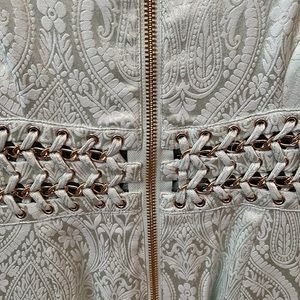 This luxurious mint green dress is beautiful with a gold chain running through the fabric. A full gold zipper down the back.