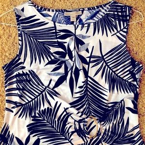 Blue & White palm trees, gathered at waist w/asymmetrical hem that swings with you! Fits every curve♥️