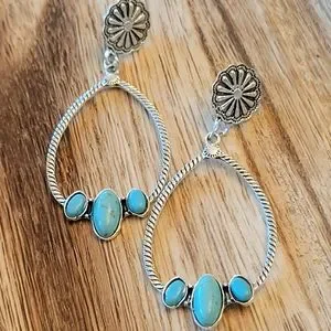 Nicely weighted, quality silversmithed antiqued teardrop twist drop dangle concho earrings featuring three turquoise howlite stones.