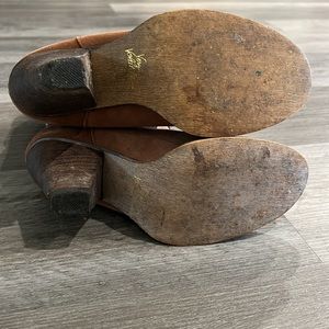 Suede leather upper, wooden riding heel, almond toe, Aztec pattern fabric shaft, good used condition, cleaned & treated prior to shipping. Questions and offers welcome, comes in slightly damaged original box.