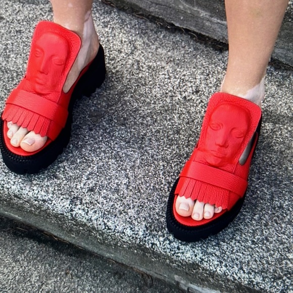 All leather made in Italy. Red with front fringe. 4” extended at the ankle with an embossed face. All leather ,heel 2”.