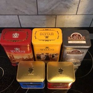 Collection of 6 loose tea metal tins. Tea is not included.