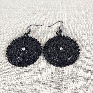 Fashion earrings, Black filagree laced design, clear stones, pierced earrings