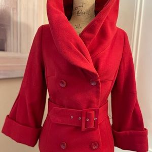 Fire engine red short Jackie O. jacket with 3/4 length sleeves and belt.
