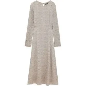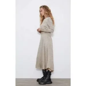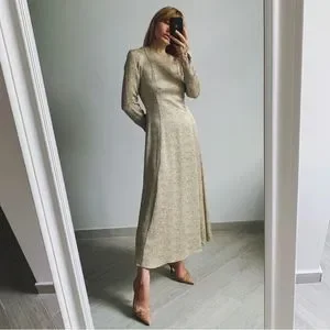 Midi dress with a round neckline and long sleeves. Fastens in the back with a zip opening and metal hook.