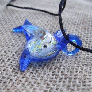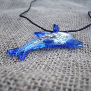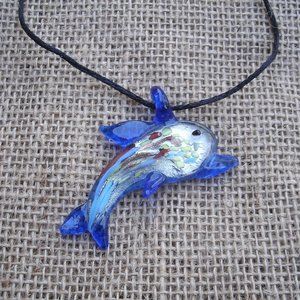Handmade Murano glass dolphin necklace. Dolphin has a clear glass front and blue back. Blue fins, tail, snout, loop. Inside has multi-color patches on a metallic silver background. Pendant is 1 3/4 inches high, 2 1/2 inches wide. On a silky black cord. Necklace is 18 inches long with a lobster clasp closure. New item from my local shop. Great for anyone who likes dolphins or art glass.