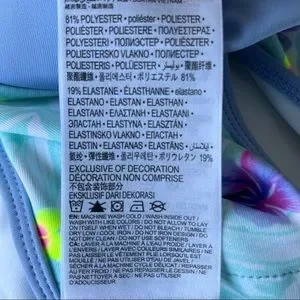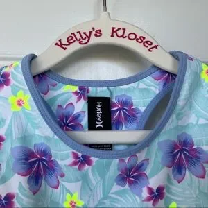 This is a great cropped length athletic tank from Hurley, girl’s size Large (12-13 years). The stretchy fabric, 81% polyester/19% elastane, is a tropical floral pattern in shades of purple and mint green, with touches of neon yellow. Features a rounded neckline, racerback, and wide elastic band at the bottom. Perfect for all types of summer athletic activities!