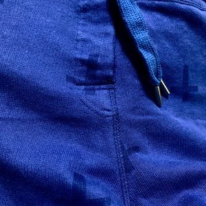 Drawstring waist. All over cross detail. Side pockets. Faux front fly with buttons. Back pocket.