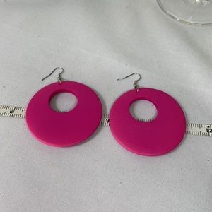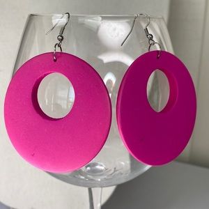 The are actually wooden earrings which have been dyed hot pink. Circles with holes and fish hook style pierced. Boho casual style ready with these fun earrings