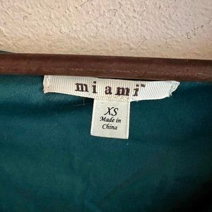 Beautiful green floral print maxi dress! It features ruffles on sleeves and bottom hemline. There are signs of minor pilling (see any photo). There are a couple flaws, the inside button, that makes it look like a wrap dress, doesn't always want to stay closed. There is also a button missing, see picture 9. There is also a tiny tear in the inside of the liner, see last picture, but it's not noticeable from the outside of the dress. It's the brand Mi ami, but I bought it from Francesca's Collections.
