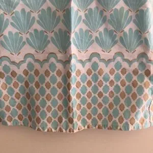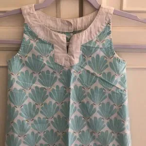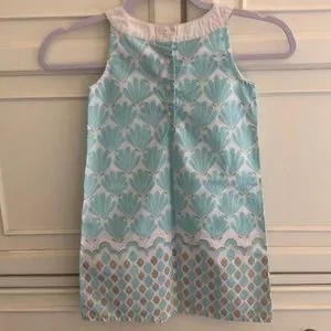White sleeveless shift dress. Scoop V neckline. Aqua scallop shell with gold detail design front and back. Aqua and gold wide diamond patterned hemline border. 4 top back buttons. 100% cotton. So preppy - reminds me of a little Lilly Pulitzer dress! EUC. Smoke free home.