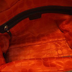 This chocolate brown kate spade New York handbag with patent leather trim, gold tone hardware and red lining has an exterior compartment in the front and three compartments inside for all your essentials. This classic bag also makes a cute carry on travel tote bag. Worn with few minor signs of wear, it is in very good used condition.