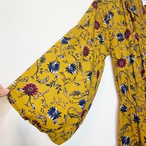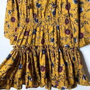 Gold/Mustard color, floral print, ruffled collar, V-neck with tassel, smocked waist, tiered ruffle skirt, large balloon sleeves