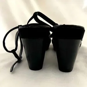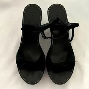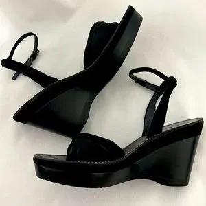 Extremely Comfortable / Simple black satin twisted with leather suede strap over the toes, adjustable leather strap with buckle around the ankle, leather footbed, wooden black wedge approx. 4.5β, awesome outer sole with nonskid bottom. Insignia on footbed and outer sole.