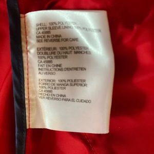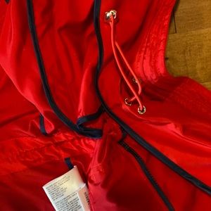 This is a gorgeous red jacket with lots of pockets and hood. Zipper with gold snaps and buckles draw string waist. Size M.