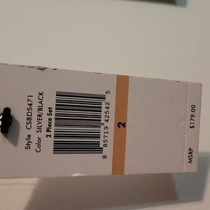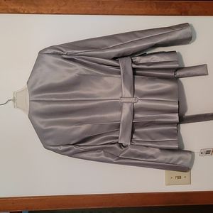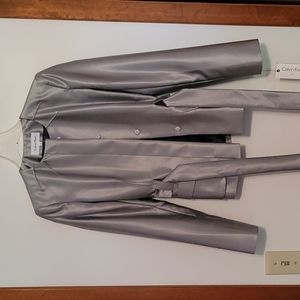 NWT Calvin Klein jacket, Size 2, color is listed as silver/ black. Was a 2 PC set, I only have the jacket. Price was $179. Snap front, tie belt, 2 front pockets.Jacket is lined. Would be very nice worn with black pants or black skirt. Pit to pit 17 inches, length 23 inches. BC
