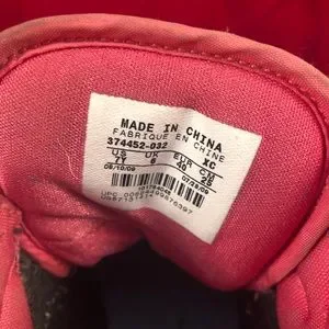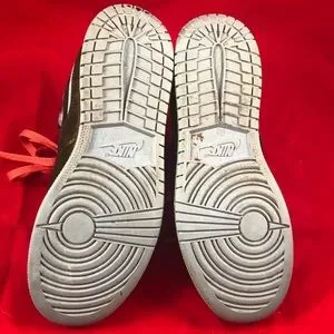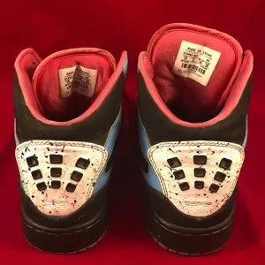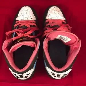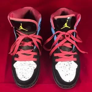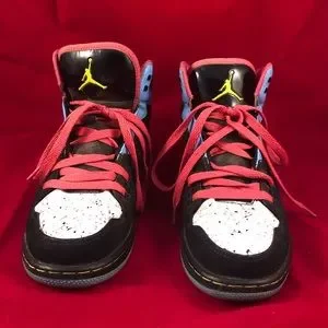 This is a pair of unique Air Jordan sneaker shoes. They are black, white, pink, and blue. Sneakers have paint splatter pattern on white part. Shoes are used and do show some where which is shown in pictures. Most can likely be removed with cleaning techniques. Pictures are of actual item you will receive. Shoes come from a smoke free and pet free home.