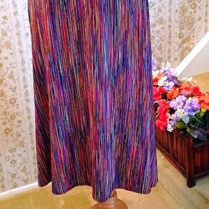 Coldwater Creek travel-knit skirt with skinny little stripes in many, many colors. Elastic waistband and bias cut, so it has a bit of swing to it. Fun to wear and goes with almost any color top!