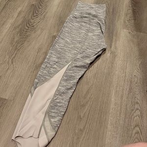 Super cute heathered gray and white with mesh detail down the leg and some scalloped cuffs at the bottom!
