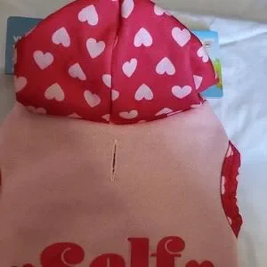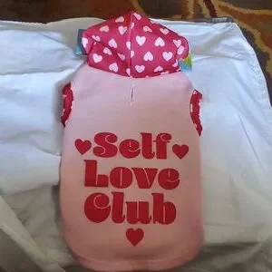 This harness is for extra small furbabies (5-10lbs). It's a hoodie with an adorable pink w/red letters. Hoodie is pink w/red letters saying SELF LOVE CLUB w/hearts. It's a cozy n warm like our sweatshirts.