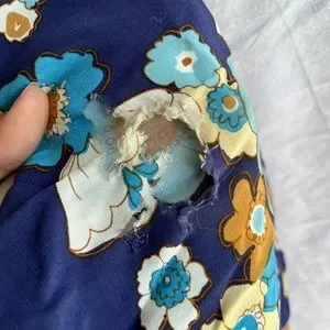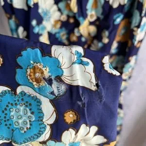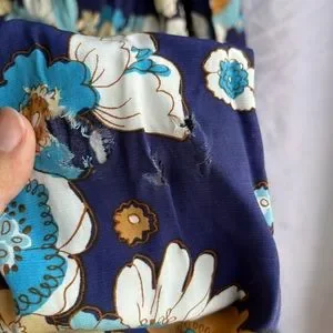 My best guess is it was hanging on a rolling rack and the right leg got stuck under a wheel. Would be perfect for a shorter gal (can hem it above the holes)