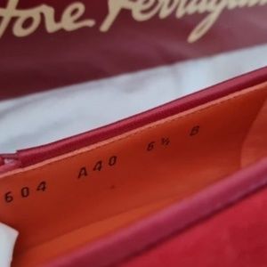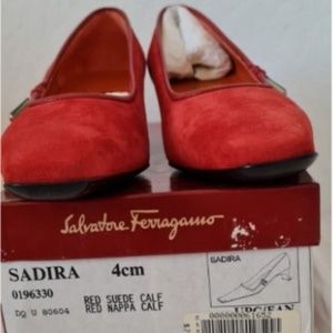 Red pumps from Salvatore Ferragamo featuring a brand embossed insole, a bow detail buckle with logo on the front and a block heel.
