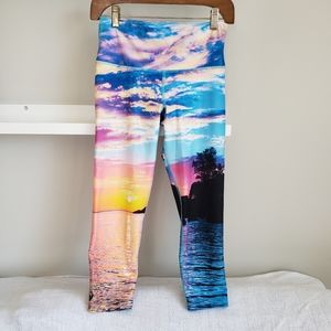 Inner Fire made in Canada capri leggings, made from recycled water bottles. Colourful bright lake sunset print allover design. Wide fabric waistband. 88% recycled polyester, 12% spandex. Size 6. Excellent condition, no pilling. Made in Vancouver. Eco-friendly.