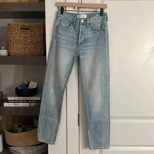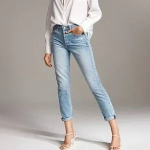 High-waisted, slightly tapered jean. An updated boyfriend fit - Inspired by the ones you've left behind, the Ex Boyfriend is a relaxed style made with premium organic cotton from Italy. Boyfriends may come and go, but these jeans are forever — non-stretch denim ensures they'll only get better with age. A slimmer fit through the hip and thigh makes the Ex Boyfriend just a bit sexier than your average. This version comes in a light medium wash with subtle distressing. Shirt is stylist's own.