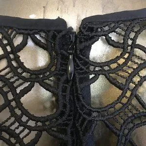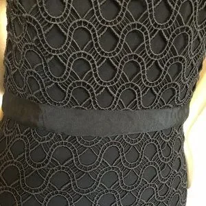 An illusion yoke and hem lend dimension to this formfitting lace Cynthia Rowley dress. Hidden zip at back. Lined.
