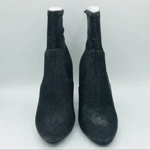 New in the box. Fabulous glittering black booties with back 5” zipper & 4” block heels. I wish these were my size! Well made and they look sooo good. These will hug your ankle making your legs appear longer by not breaking the silhouette.