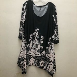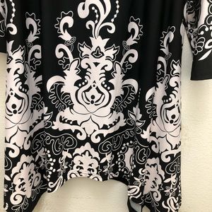Women Size 2XL Black &White Tunic Top style dress with scoop neckline and 3/4 sleeve. Exquisite floral design Stretch/Relaxed fit. It can be worn as casual and dressed up. Made from 95% polyester and 5% spandex. See pictures for details.