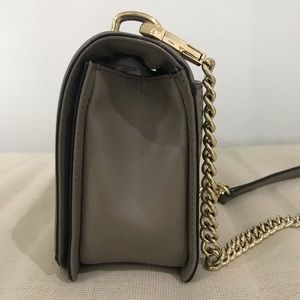 This chevron quilted gray/taupe/mushroom colored bag with shiny gold hardware is in great condition. It is the medium size and measures 10”W x 6”H x 3”D. It has a front flap with turn lock closure and a back magnetic closure slip pocket. On the interior it has a zipper pocket as well as a small slit pocket. There are very minor signs of wear (a tiny amount to the hardware and a scratch to the leather - please see photos).