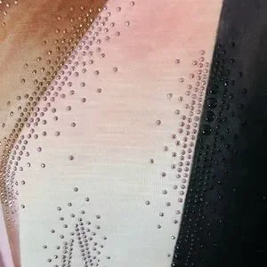 Wine, light pink, black, brown, beige on white top, embellished with tiny sparkles. 100% Polyester pull-over top, 3/4 length sleeves.