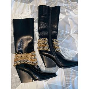 Mixed metallic chains around the ankle provide an edge update for a patent-leather knee-high boot with a wedge heel and pointy toe.