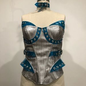 One of a kind steel boned corset made from textured silver leatherette with clear blue tinted plastic details, bright shiny nickel eyelets and hardware. Adjustable side buckle, and lace up back. Fits approx size LARGE. Fully lined with contrasting blue poplin. Matching collar included. Handmade by me. All photos are mine.