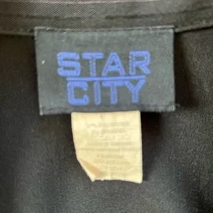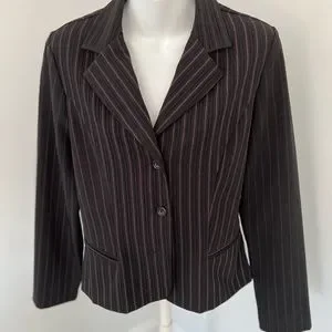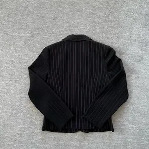 This vintage Star City blazer is black with a pink pinstripe. It has a 3 button closure. There are no pockets. It has small shoulder pads which can be removed if you don’t like them.