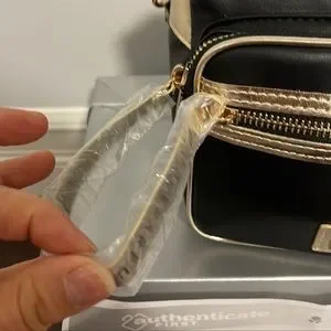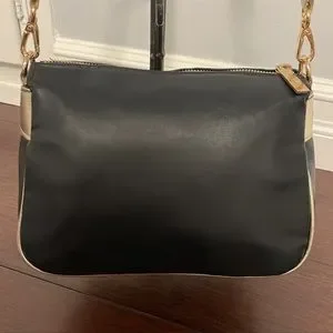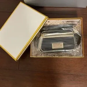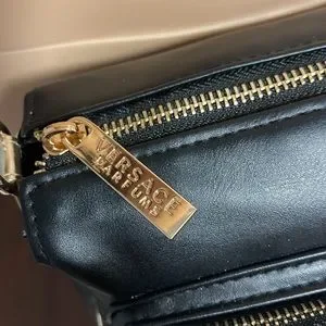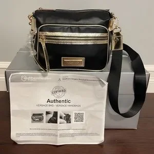 New , authentic Versace black and gold faux leather cosmetics shoulder bag.