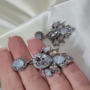 Gorgeous shimmery shades of pinks and blues in a high glam look. Make an elegant statement with these nicely weighted, high quality special occasion pieces. Hypoallergenic alloy backs.