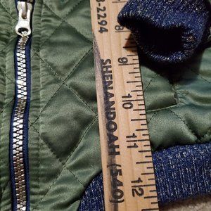 Girls Bomber Style Jackety, Size 18 mos., zippered, quilted satin with embroidered design. 'Army green', metallic navy trim on sleeves and neck, washable.