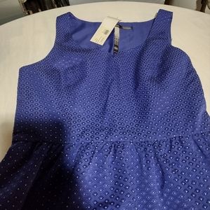 NWT Cobalt blue and White Sleeveless dress with sweetheart neck line. It has a 1.5" Shoulder Straps. There is a lining underneath the skirt area. It has a zipper with a hook and eye closure on the side under your arm. It has a sideways blue embroidered diamond shape with white in the middle of it. There is gathering around the waist that helps it look fluffy.