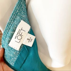 -Loft tulip teal tweed skirt. Back zip, fully lined. Can be worn as a high waisted skirt (for people who traditionally wear size 6-8) or lower on the hips for size zero, see measurements