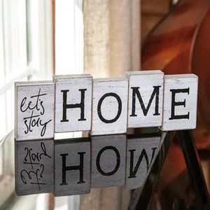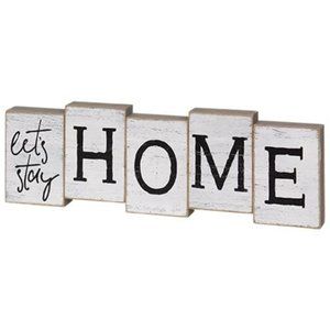 The freestanding Let's Stay Home Block Sitter is made from lightly distressed wood. Cut with a unique staggered design, it reads "Let's Stay Home", with the word "Home" spelled out across four blocks. It measures 3.5" high by 10" wide and makes a great end table or shelf accent.