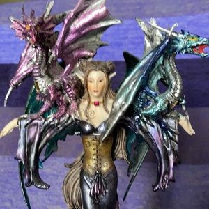 New WO box, exquisite woman! Medieval fantasy figurine, with two dragons; purple and blue. Fairy has transparent acrylic turquoise wings. Figurine is made of resin. Gorgeous iridescent colors and intricate craftsmanship. Really the pictures don't do justice. See the last pictures for price comparison. Preowned in excellent condition. Poshmark's suggested price is $48