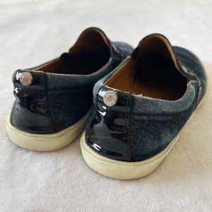 Denim and fabric slip-on featuring polished finishing and rear details.