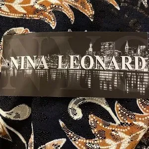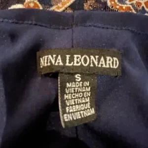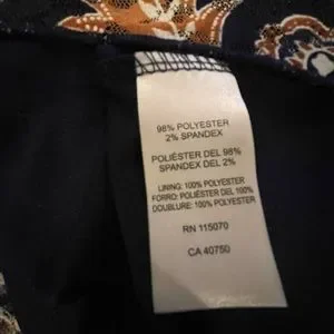 Lightweight navy polyester semi sheer lace non stretch fabric. Beautiful floral print throughout. Colors include peach, white, golden brown and light golden brown. Lined in navy stretch polyester fabric with attached shorter slip. Rounded neck. Matching fabric shoulder straps. Sleeveless. Handkerchief bottom ends.