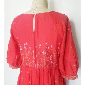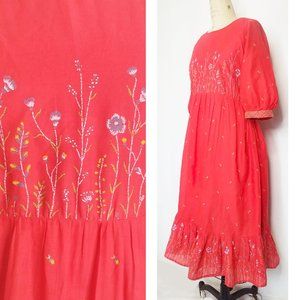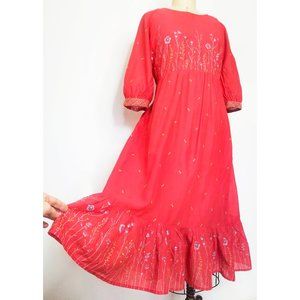 Vintage Womens Prairie Dress Boho Bohemian Empire Waist Floral Summer Red M/L